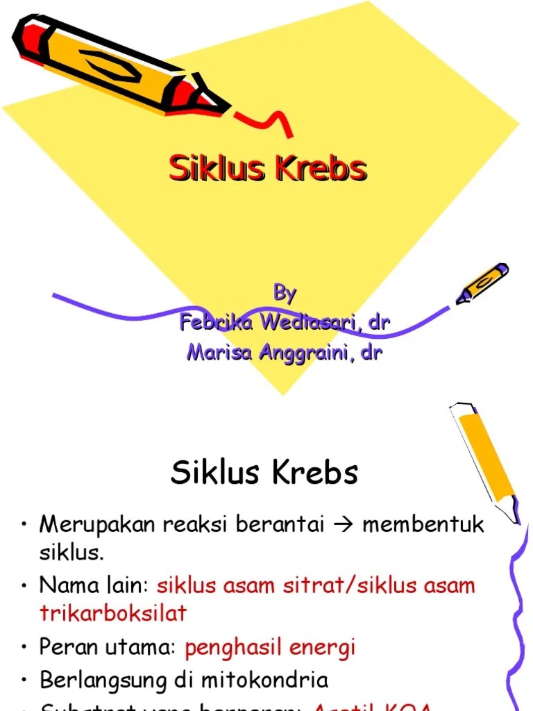 100% (1) 100% found this document useful (1 vote) 24 views 54 pages. Siklus krebs siklus asam sitrat Yulia suciati krebs cycle, electron transport and oxidative phosphorylation yulia suciati. Simpan simpan siklus krebs untuk nanti. Siklus krebs siklus asam sitrat terjadi didalam matriks mitokondria proses ini bersifat aerobik fungsi utama siklus asam sitrat (siklus krebs) a/ bekerja sbg lintasan akhir bersama untuk oksidasi kh, lipid, protein. Scribd adalah situs bacaan dan penerbitan sosial terbesar di dunia. Pengertian siklus krebs fase kedua respirasi aerob adalah siklus krebs. Dari daur krebs akan keluar elektron dan ion h+ yang dibawa sebagai nadh2 (nadh + h+ + 1 elektron) dan fadh2, sehingga di dalam mitokondria (dengan adanya siklus krebs yang dilanjutkan dengan oksidasi melalui sistem pengangkutan elektron) akan terbentuk air, sebagai hasil sampingan respirasi selain co2 (bambang heri gunawan, 2006). Scribd adalah situs bacaan dan penerbitan sosial terbesar di dunia. Scribd adalah situs bacaan dan penerbitan sosial terbesar di dunia. Download as ppt, pdf, txt or read online from scribd. 0 penilaian 0% menganggap dokumen ini bermanfaat (0 suara) 632 tayangan 13 halaman. Siklus kreb disebut juga sebagai siklus asam sitrat, yaitu serangkaian reaksi kimia dalam sel pada mitokondria yang berlangsung secara berurutan dan berulang.